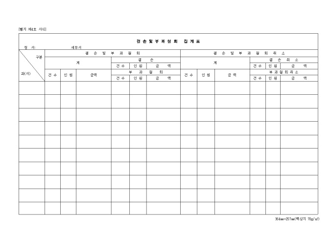 9,000원/월제4호 결손 및 부과철회 집계표 양식입니다. 결손 및 부과 철회 및 결손 및 부과 철회 취소 등을 기재합니다.