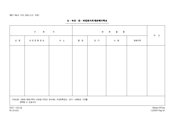 제4호 농축산임어업용기자재판매기록표(2001.12.31. 개정)