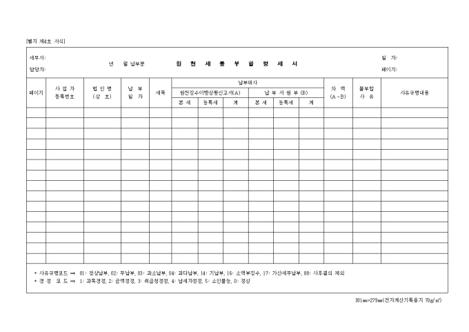 9,000원/월제4호 원천세불부합 명세서 양식입니다. 페이지, 사업자 등록번호, 법인명, 납부 일자, 세목, 납부대사, 차액, 불부합 사유, 사유 규명 내용 등을 기재합니다.