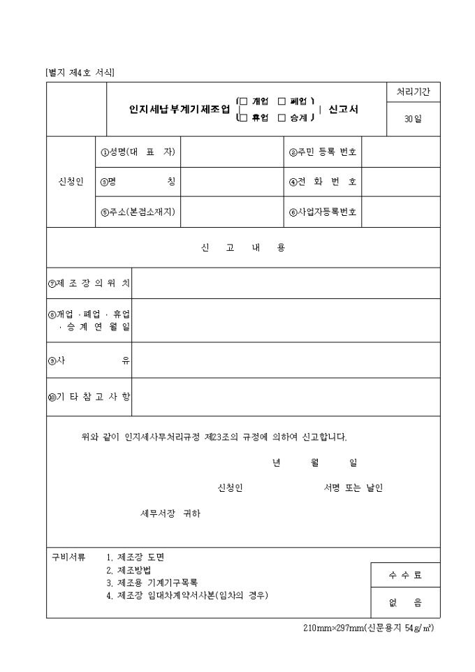 9,000원/월제4호 인지세 납부 계기제조업개업 신고서 양식입니다. 성명, 주민 등록번호, 명칭, 주소, 전화번호, 사업자 등록번호, 제조장의 위치, 사유 등을 기재합니다.