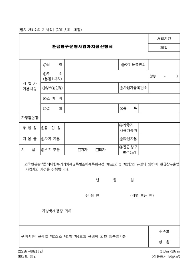 제4호의2 환급창구운영사업자지정신청서(2001.3.31. 개정)