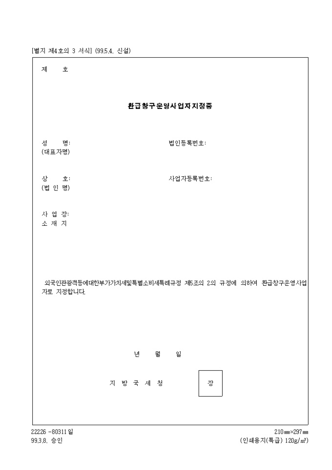 9,000원/월제4호의3 환급 창구 운영 사업자 지정증(1999.5.4. 신설) 양식입니다. 성명, 법인등록번호, 상호, 사업자 등록번호, 사업장 소재지 등을 기재합니다.