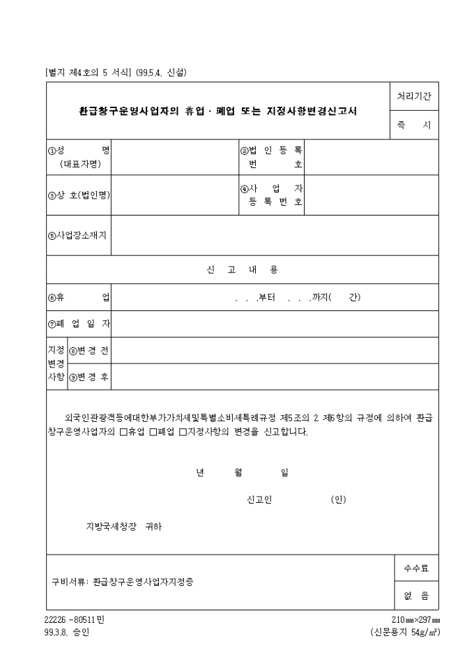 9,000원/월제4호의5 환급창구운영사업자의 휴업.폐업 또는 지정사항변경신고서(1999.5.4. 신설)
