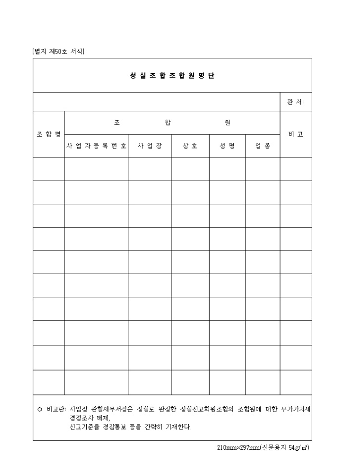 ○ 비고란: 사업장 관할세무서장은 성실로 판정한 성실신고회원조합의 조합원에 대한 부가가치세 경정조사 배제,