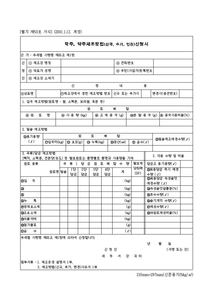 제50호 탁주, 약주류 중 약주제조방법(신규, 추가, 변경)신고서(2001.1.12. 개정)
