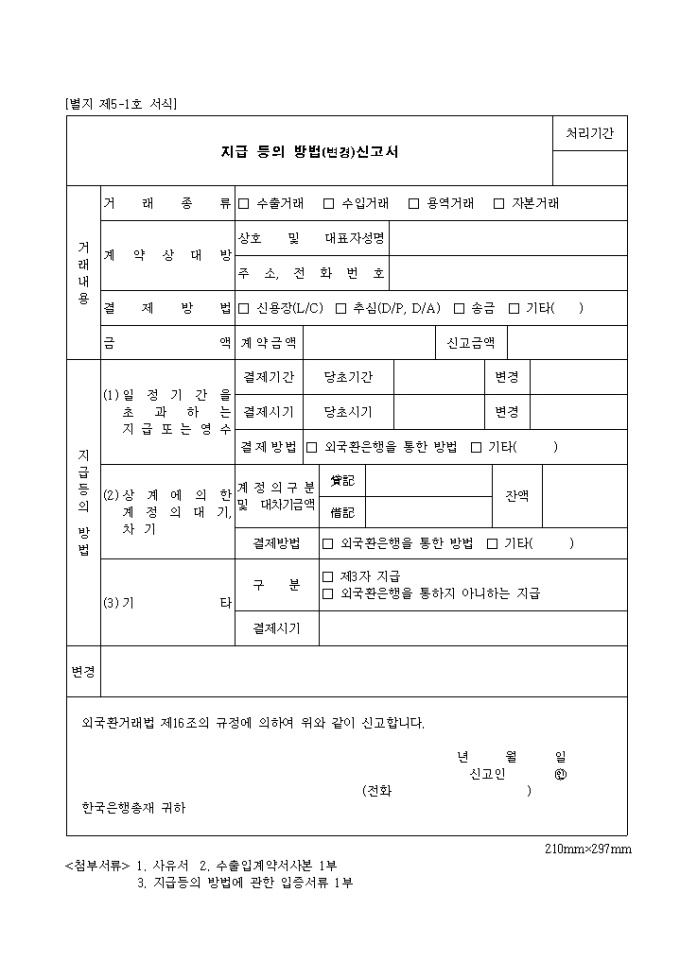 제5-1호 지급 등의 방법(변경)신고서 양식입니다. 거래내용(거래종류, 계약 상대방, 결제방법, 금액), 지급등의 방법(일정기간을 초과하는 지급 또는 영수, 상계에 의한 계정의 대기,차기, 기타) 등을 기재합니다.