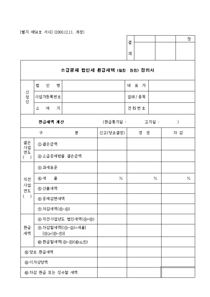 제54호 소급공제 법인세 환급세액(결정 경정)결의서 (2000.12.11. 개정)양식입니다. 신청인의 법인명, 사업자등록번호, 소재지, 대표자, 업태/종목, 전화번호, 결손사업 연도, 직전사업연도, 환급세액 등을 기재합니다.