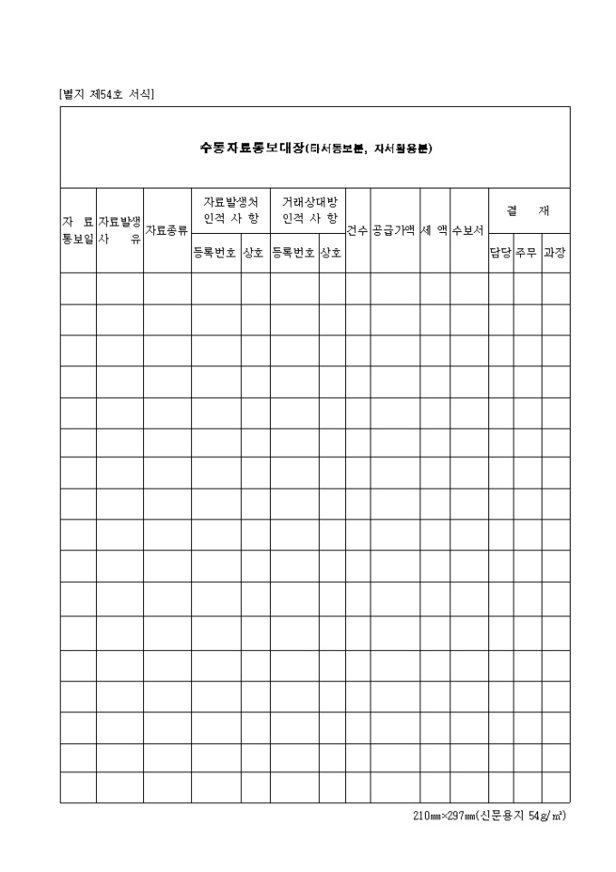제54호 수동 자료 통보 대장 양식입니다. 자료 통보일, 자료 발생 사유, 자료 종류, 자료 발생처 인적 사항, 거래상대방 인적 사항, 건수, 공급 가액, 세액, 수보서, 결재 등을 기재합니다.