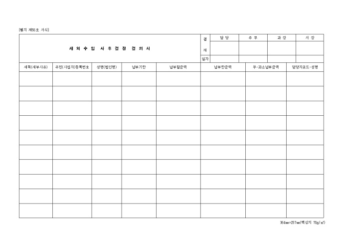 9,000원/월제56호 세외수입사후결정결의서 세목(세부사유) 주민(사업자)등록번호 성명(법인명) 납부기한 납부할금액 무과소납부금액 담당장코드 성명 등의 항목을 기입한 세외 수입사후 결정 결의서 양식입니다.