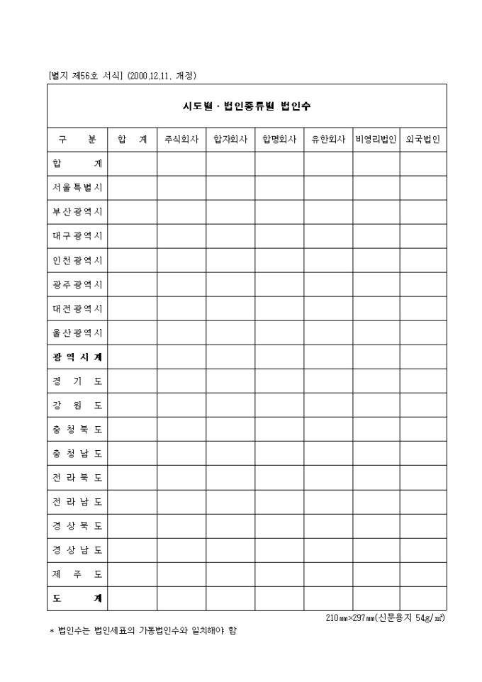 9,000원/월제56호 시도별 법인종류별 법인수 (2000.12.11. 개정) 양식입니다. 구분에 따른 합계, 주식회사, 합자회사, 합명 회사, 유한회사, 비영리 법인, 외국법인 등을 기재합니다.
