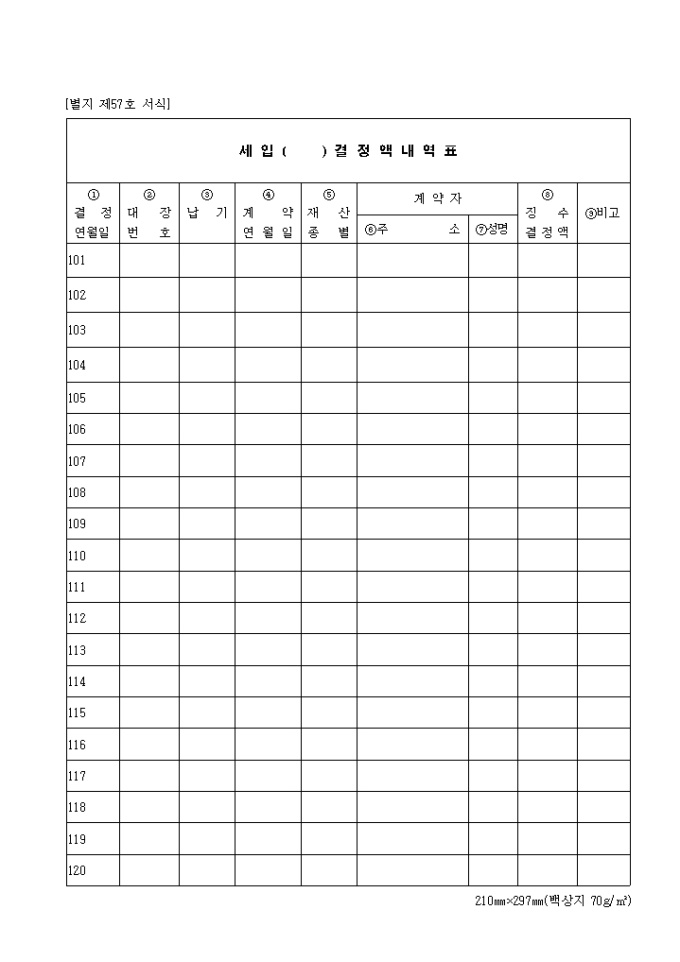 9,000원/월제57호 세입결정내역표 양식입니다. 결정 연월일, 대장번호, 납기, 계약 연월일, 재산 종별, 주소, 서명, 징수 결정액, 비고 등을 기재합니다.