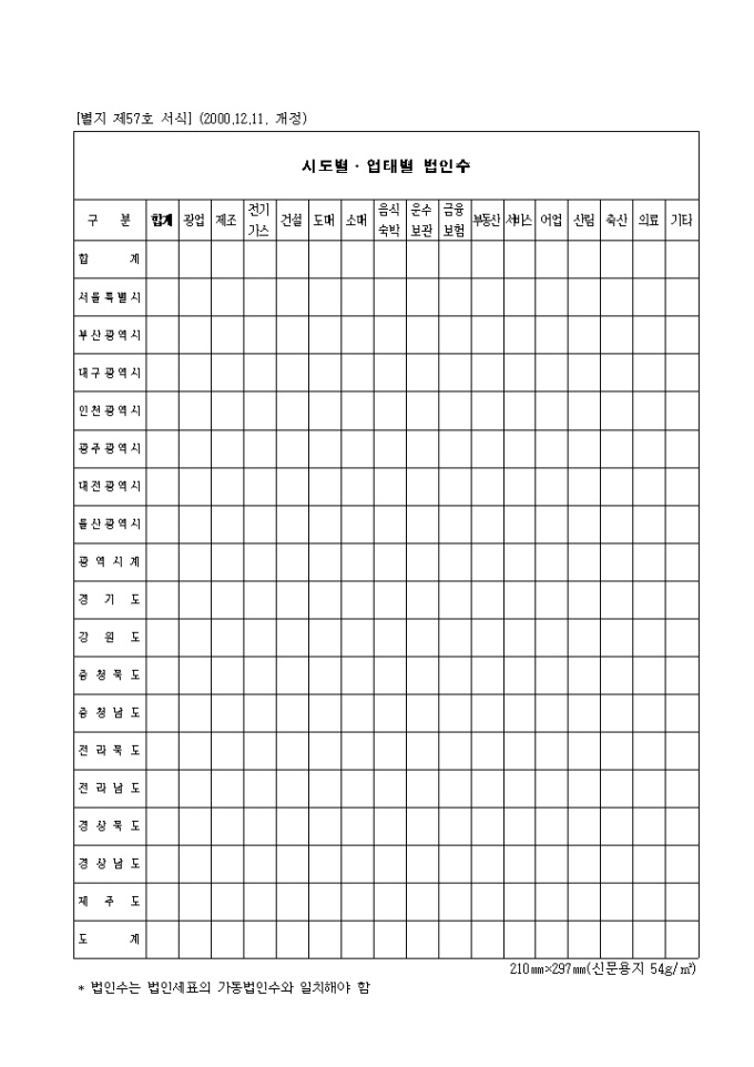 9,000원/월제57호 시도별 업태별 법인수 (2000.12.11. 개정) 양식입니다. 시도별 합계, 광업, 제조, 전기가스, 건설, 도매, 소매, 음식숙박, 운수 보관, 금융 보험, 부동산, 서비스, 어업, 산림, 축산, 의료, 기타 등을 기재합니다.