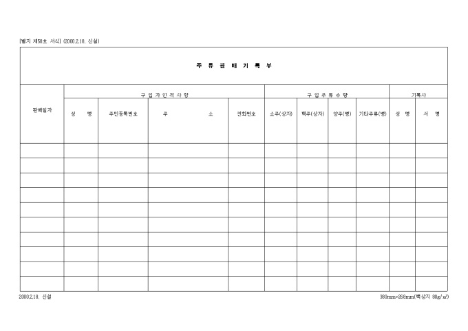 판매일자 구입자인적사항 성명 주민등록번호 주소 전화번호 등의 항목을 기입하는 주류판매 기록부 양식입니다.