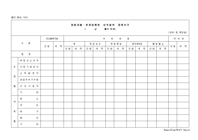 9,000원/월제5호 결손처분.부과철회자 사후관리 결과보고 양식입니다. 전산출력자료, 처리내용, 미처리 등을 기재합니다.