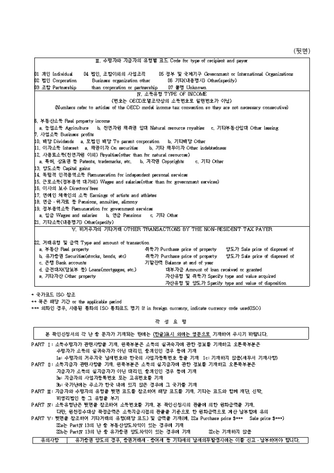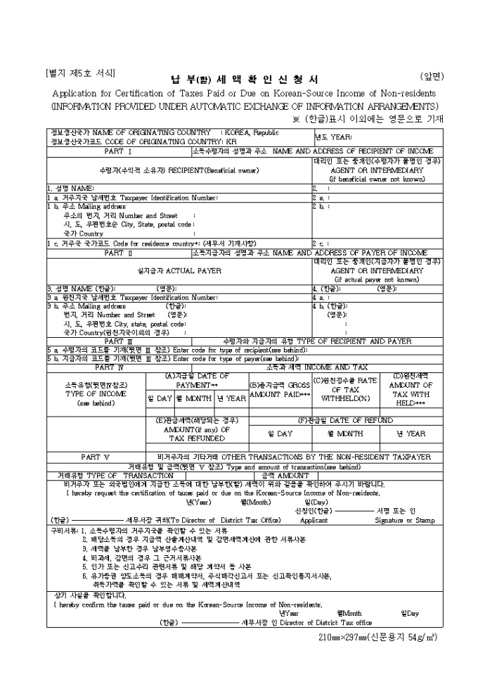 제5호 납부(할)세액 확인 신청서 양식입니다. Application for Certification of Taxes Paid or Due on Korean-Source Income of Non-residents 한글과 영문으로 기재되어 있습니다.