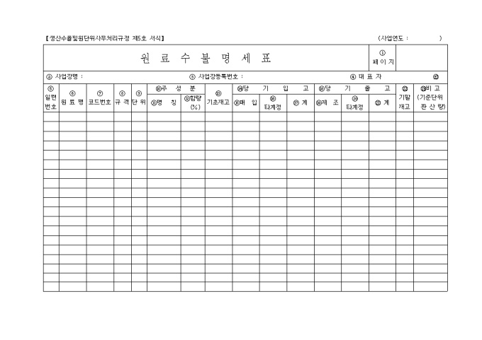 【생산수율 및 원단위 사무처리규정 제5호 서식】