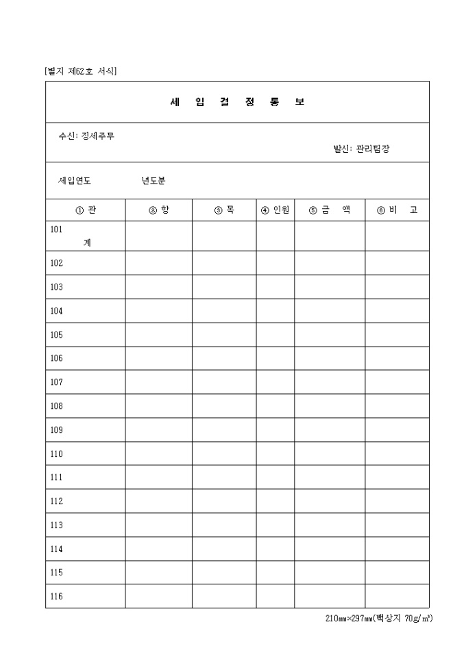9,000원/월관, 항, 목, 인원, 금액 등을 기록하여 통보하는 제62호 세입결정통보 양식입니다.