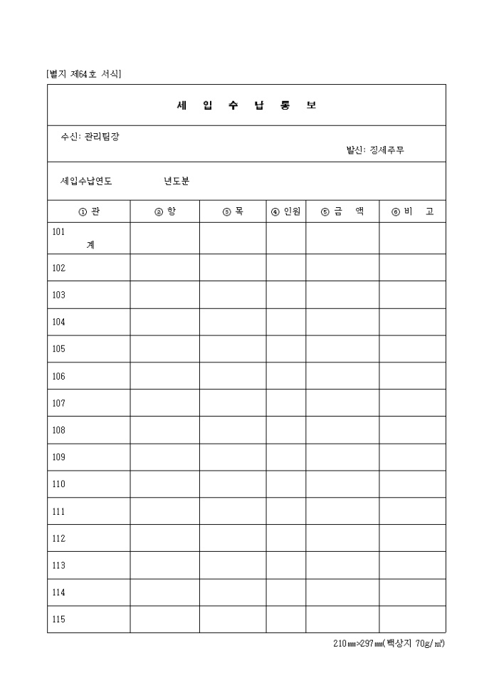 9,000원/월관, 항, 목, 인원, 금액 별로 기록하여 통보하는 제64호 세입수납통보 양식입니다.
