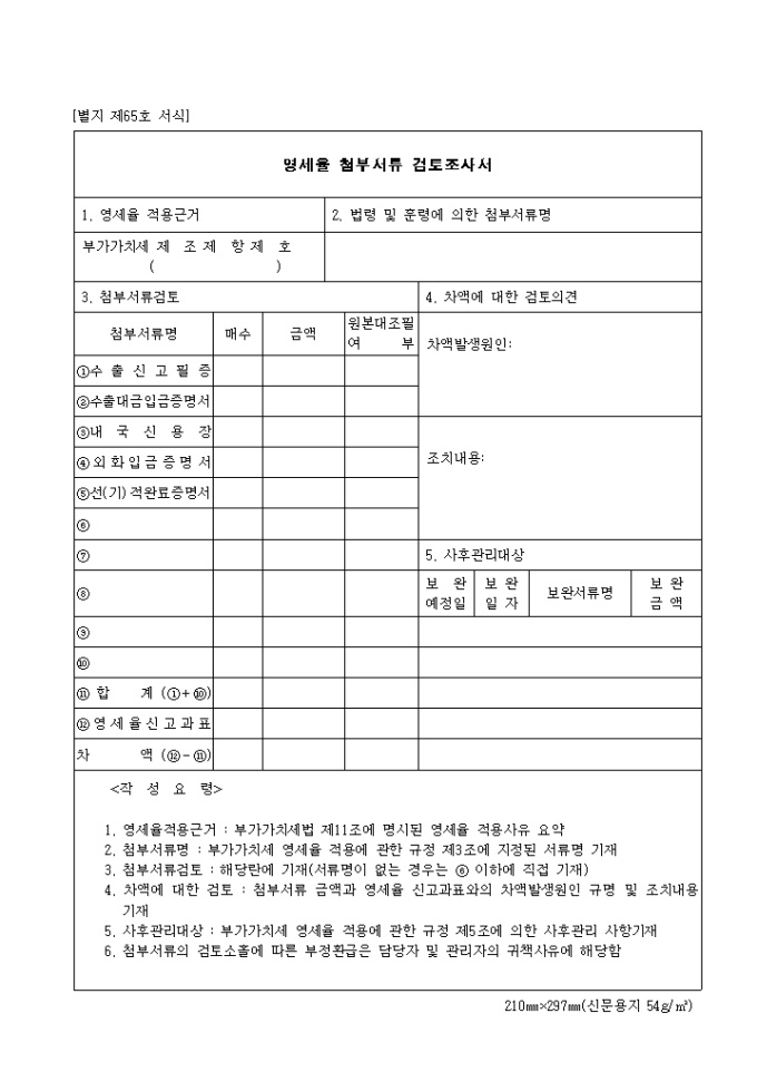 제65호 영세율첨부서류검토조사서 양식입니다.