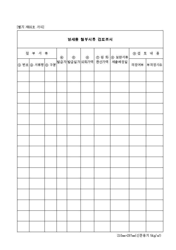 9,000원/월제66호 영세율 첨부서류 검토조서 양식입니다. 번호, 서류명, 구분, 발급자, 발급일자, 외화가액, 원화 환산가액, 보완서류 제출 예정일, 검토내용 등을 기재합니다.