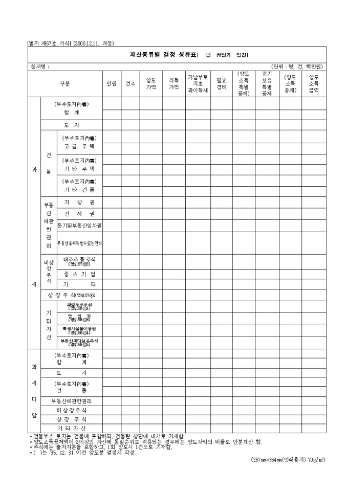 제67호 자산종류별 결정상황표(2000.12.11. 개정) 양식입니다. 구분에 따른 인원, 건수, 양도가액, 취득가액, 기납부 토지초과 이득세, 필요경비, 장기보유 특별공제 등을 기재합니다.