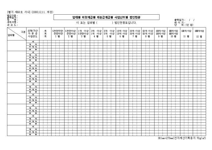 제68호 업태별 외형계급별 자본금계급별 사업연도별 법인현황 (2000.12.11. 개정) 양식입니다.