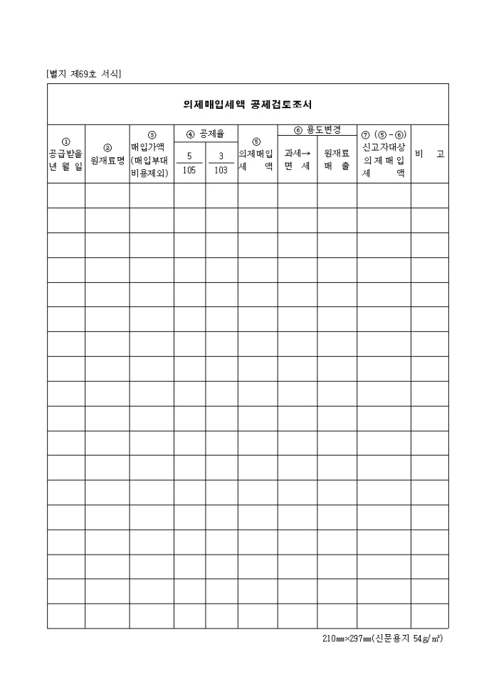 제69호 의제매입세액 공제검토조서 양식입니다. 공급받을 년월일, 원재료명, 매입가액, 공제율, 의제매입 세액, 용도변경, 신고자 대상의제매입 세액, 비고 등을 기재합니다.