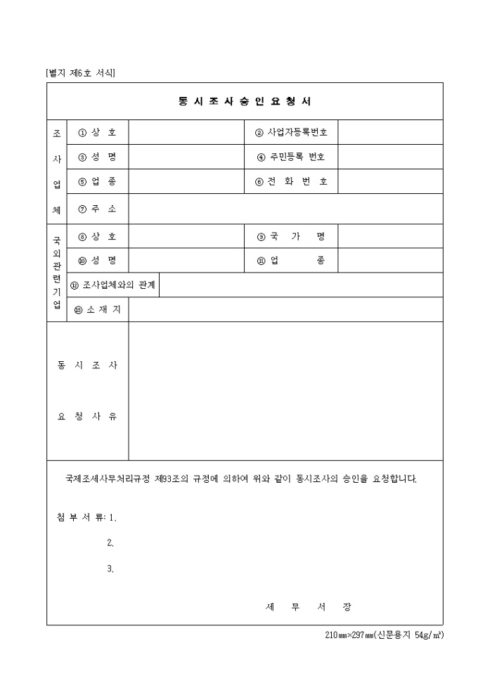 제6호 동시조사승인요청서 양식입니다. 조사업체(상호, 사업자 등록번호, 성명, 주민등록번호, 업종, 전화번호, 주소), 국외관련기업(상호, 성명, 조사업체와의 관계, 소재지, 국가명, 업종), 동시 조사 요청사유 등을 기재합니다.