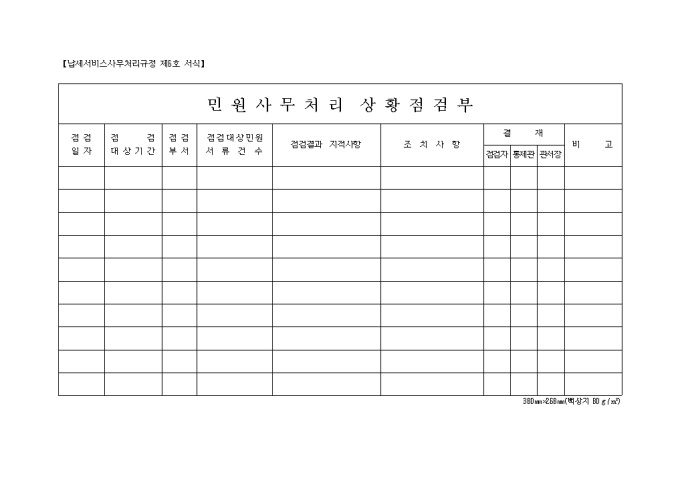 점검일자 점검대상기간 점검부서 점검대상민원 서류건수 점검결과 지적사항 조치사항 등의 항목을 기입한 민원 사무처리상황 점검부 양식입니다.