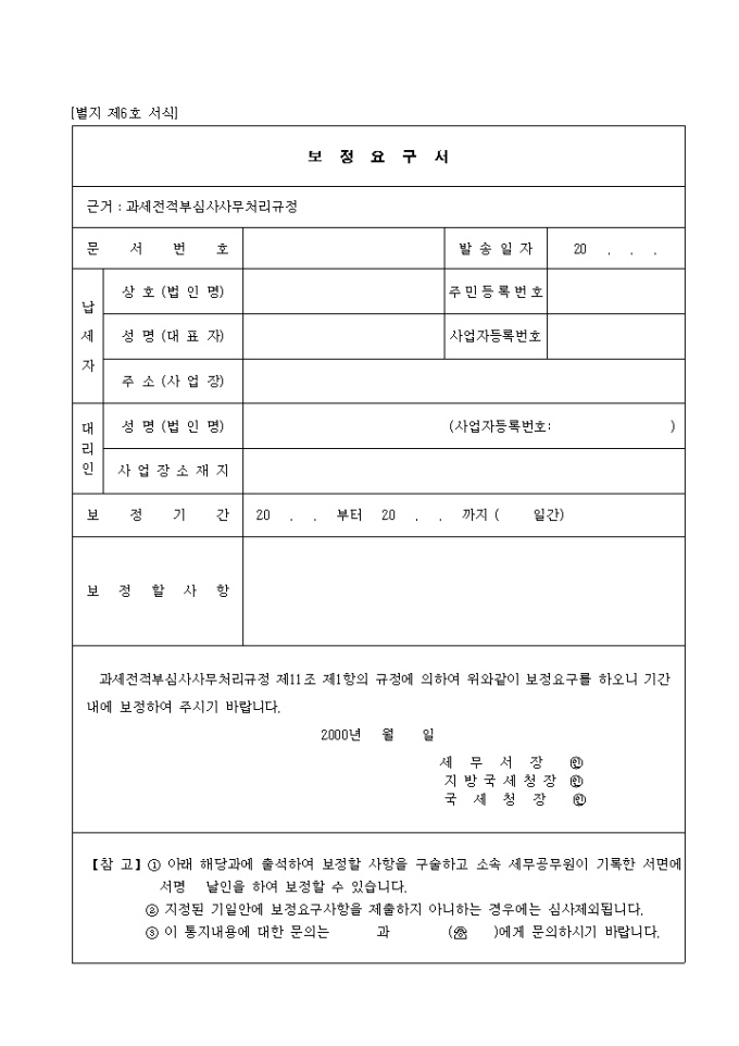 9,000원/월과세전적부심사사무처리규정 제11조 제1항의 규정에 의하여 보정요구를 하오니 기간내에 보정을 요하는 제6호 보정요구서 양식입니다.