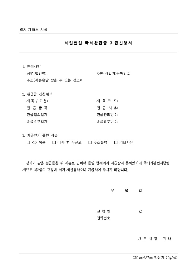상기와 같은 환급금은 위 사유로 인하여 금일 현재까지 지급받지 못하였기에 국세기본법시행령제37조 제2항의 규정에 의거 재신청하오니 지급을 요하는 제70호 세입편입 국세환급금 지급신청서 양식입니다.