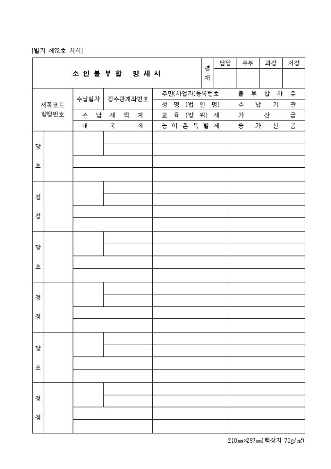 수납일자, 징수관계좌번호, 수납세액계, 내국세, 주민등록번호 등을 기록하여 명세하는 제72호 소인불부합명세서 양식입니다.
