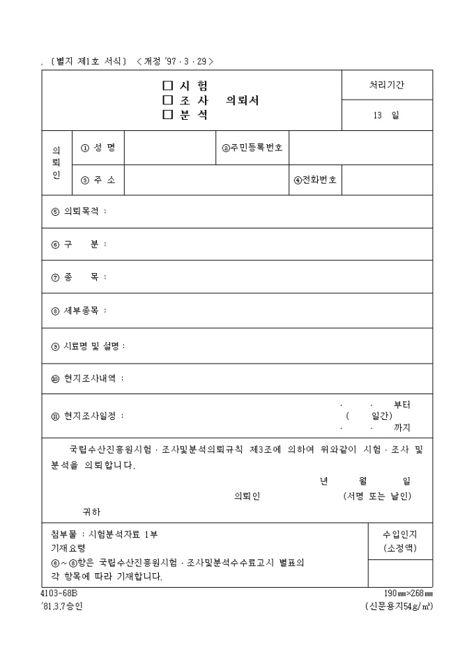국립수산진흥원시험․조사및분석의뢰규칙 제3조에 의하여 위와같이 시험․조사 및 분석을 의뢰하고자 할 때 사용하는 "수산가공 원료 및 제품의 수온과 첨가물 소요량 조사(시험,분석)의뢰서" 양식입니다.