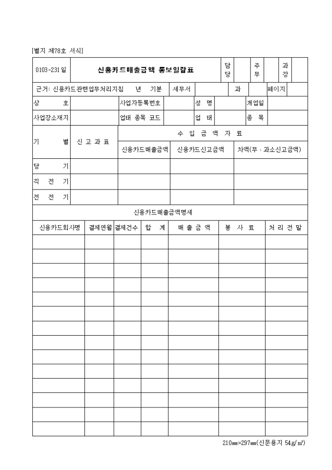 9,000원/월제78호 신용카드매출금액통보일람표 근거: 신용카드관련업무처리지침 년 기분 상호 사업자등록번호 사업장소재지 성명 개업일 기별 당기 직전기 등의 항목으로 구성된 신용카드 매출금액 통보일람표 양식입니다.