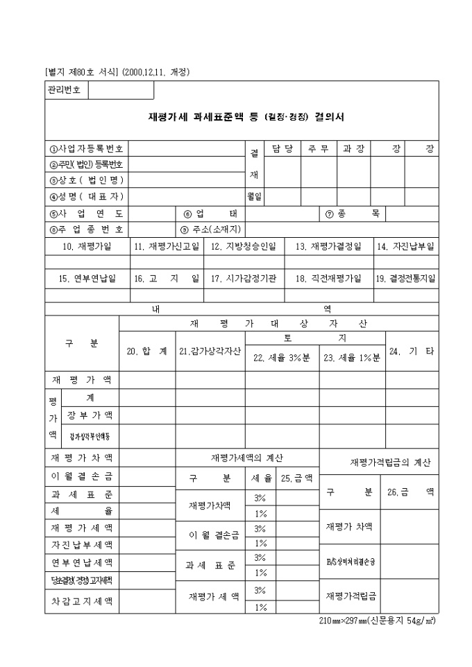 9,000원/월재평가대상자산을 관리하는 제80호 재평가세과세표준액 등(결정 경정)결의서 (2000.12.11. 개정) 양식입니다.