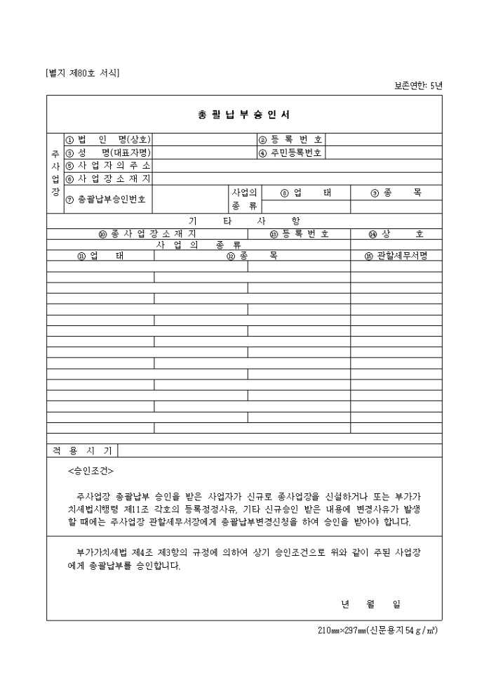 9,000원/월제80호 총괄 납부 승인서 양식입니다. 법인명, 등록번호, 성명, 주민등록번호, 사업장 소재지, 총괄납부 승인번호, 업태 종목 등을 기재합니다.