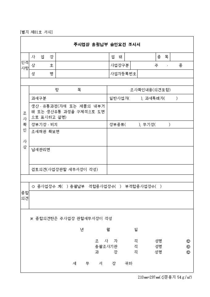9,000원/월제81호 주사업장 총괄납부 승인요건 조사서 양식입니다. 인적사항(사업장, 상호, 성명, 업태, 사업장구분, 사업자등록번호), 조사확인 사상, 종합의견 등을 기재합니다.