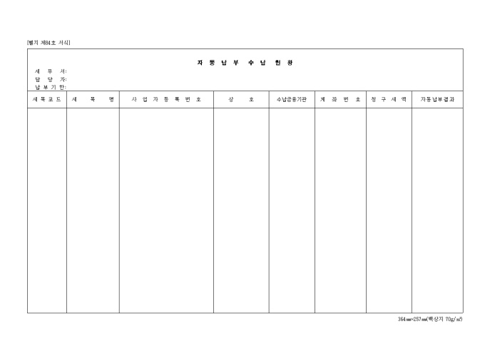 9,000원/월제84호 자동 납부수납현황 양식입니다. 세목코드, 세목명, 사업자 등록번호, 상호, 수납금융기관, 계좌번호, 청구세액, 자동납부결과 등을 기재합니다.