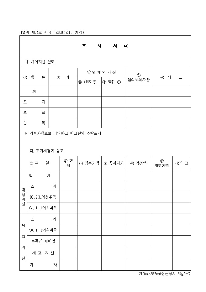 제84호 조사서(4) (2000.12.11. 개정) 양식입니다. 제외자산 검토, 토지재평가 검토 등을 기재합니다.
