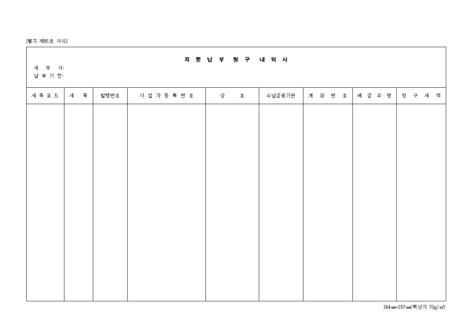 제85호 자동납부 청구내역서 양식입니다. 세목코드, 세목, 발행번호, 사업자 등록번호, 상호, 수납금융기관, 계좌번호, 예금주명, 청구세액 등을 기재합니다.