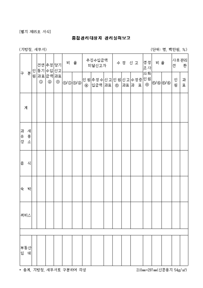 9,000원/월제85호 중점 관리 대상자 관리 실적 보고 양식입니다. 전연동기과표, 추정수입금액, 당기신고과표, 비율, 추징수입금액 미달신고자, 수정신고, 경정조사의뢰 인원, 비율, 사후처리 전환 등을 기재합니다.