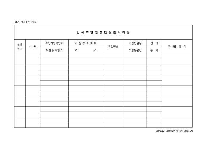 제8-6호 납세조합원명단 및 관리대장 양식입니다. 일련번호, 성명, 사업자 등록번호, 주민등록번호, 사업장 소재지, 주소, 전화번호, 개업연월일, 가입 연월일, 업태, 종목, 관리 번호 등을 기재합니다.