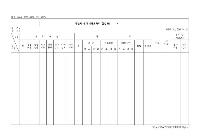 9,000원/월제86호 재산제세 과세 자료 처리 점검표(2000.12.11. 개정) 양식입니다. 처리대상, 처리, 미결, 처리비율 1인당 처리건수 등을 기재합니다.