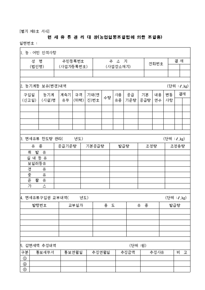 제8호 면세유류관리대장(농업협동조합법 산림조합법에의한 조합용) 양식입니다.