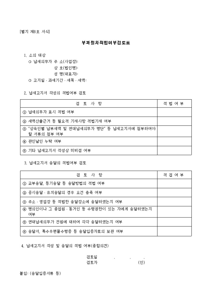 9,000원/월제8호 부과 절차 적법 여부 검토표 양식입니다. 소의 대상, 납세고지서 작성의 적법여부 검토, 납세고지서 송달의 적법여부 검토, 납세고지서 작성 및 송달의 적법 여부(종합의견) 등을 기재합니다.