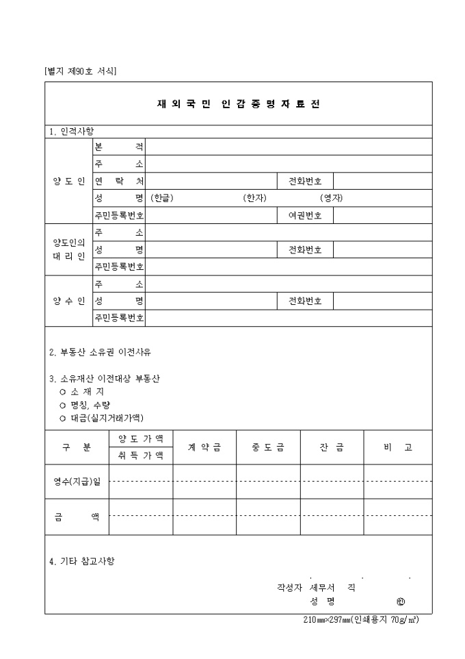 1. 인적사항 2. 부동산 소유권 이전사유 3. 소유재산 이전대상 부동산 4. 기타 참고사항 제90호 재외국민 인감증명자료전 양식입니다.