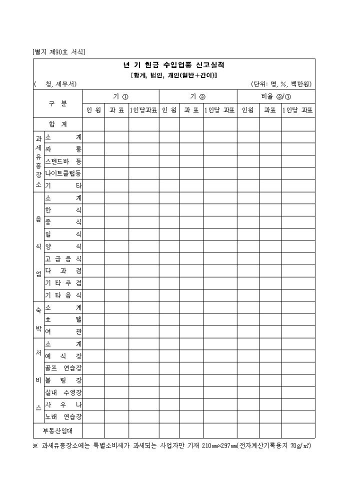 9,000원/월과세유흥장소, 음식업, 숙박, 서비스 관련 인원, 과표, 1인당표 등을 기록하는 제90호 현금수입업종신고실적 양식입니다.