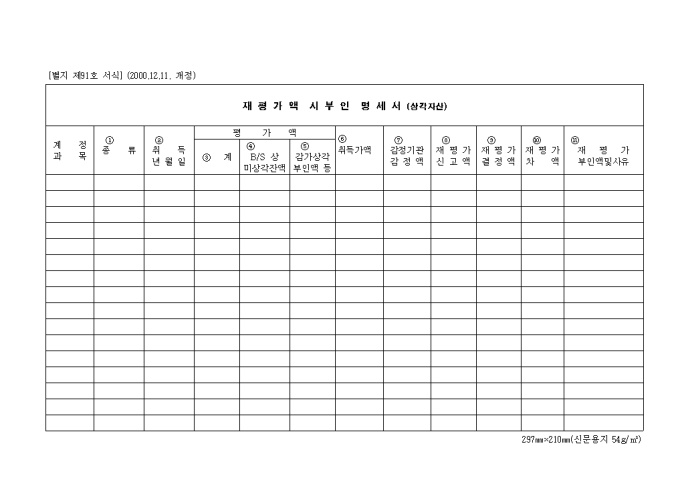 9,000원/월제91호 재평가액시부인 명세서(상각자산) (2000.12.11. 개정) 양식입니다. 계정과목, 종류, 취득 년월일, 계, B/S상 미상각잔액, 감가상각 부인액 등, 취득가액, 감정기관 감정액, 재평가 신고액, 재평가 결정액, 재평가 차액, 재평가 부인액 및 사유 등을 기재합니다.