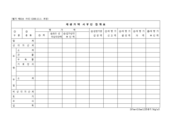 9,000원/월제92호 재평가시부인액 집계표 (2000.12.11. 개정)양식입니다. 구분, 종류, 계, B/S상 미상각잔액, 감가상각 부인액, 감정기관 감정액, 재평가 신고액, 재평가 결정액, 재평가 차액, 재평가 부인액 등을 기재합니다.