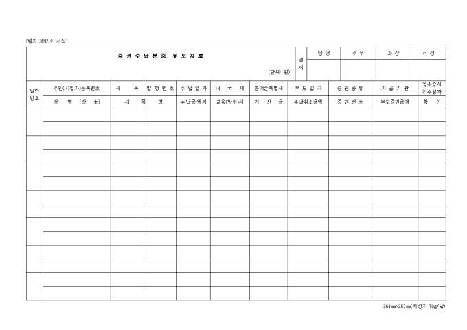 제92호 증권 수납분중부도자료 양식입니다. 일련번호, 주민등록번호, 성명, 세목, 발행번호, 수납일자, 내국세, 교육세 등을 기재합니다.